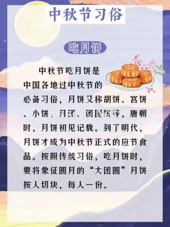 赏月是中秋节不可或缺的传统习俗。自古以来,人们就有中秋之夜赏月祈福的习惯。无论是家人团聚,还是朋友相约,都会共赏明月,感受团圆的温馨与美好。同时,猜灯谜、唱歌等娱乐活动也为赏月增添了不少乐趣。