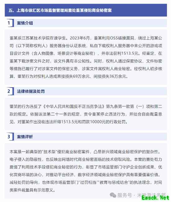 近日,国家市场监督管理总局公布八起侵犯商业秘密典型案例,上海市徐汇区市场监督管理局查处的“董某侵犯商业秘密案”入选其中。此前,侵权人董某(网名LinXX)作为知名泄密团伙“TC”的组建者,长期发布《原神》游戏涉密内容,并通过技术手段非法获取米哈游预研项目的未公开内容后,在网络群组内传播牟利。米哈游向徐汇区市场监督管理局举报后,执法人员经过调查核实后认定,董某的行为侵害了企业商业秘密,依法责令其停止违法行为,没收违法所得并处以罚款。国家市场监督管理总局指出,该案的查处有力震慑了利用技术手段侵犯商业秘密的行为,彰显了市场监管部门守护企业创新成果、优化营商环境的决心,对推动平台经济、数字经济领域商业秘密保护具有重要借鉴价值。此外,减轻处罚的导向,也体现市场监管部门“过罚相当”“教育与惩戒结合”的执法理念,对同类案件裁量具有示范意义。