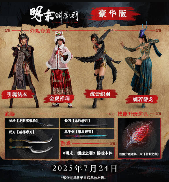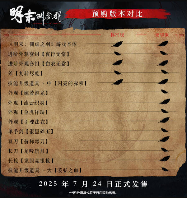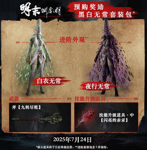 明末:渊虚之羽即将于7月24日上午10点正式于Steam解锁,在游戏发行前预购的玩家都可以获得“黑白无常套装包”、武器斧“九转乾坤”、技能升级道具·中“闪亮的赤汞”,当然这些预购奖励的内容于游戏正式上线后会以DLC的形式进行出售,错过预购奖励的玩家也可以后续进行购买,下面就为大家介绍明末:渊虚之羽预购奖励及豪华版的额外内容。
