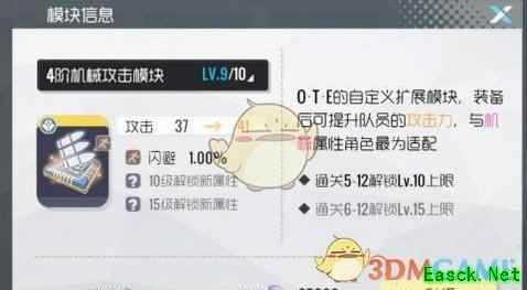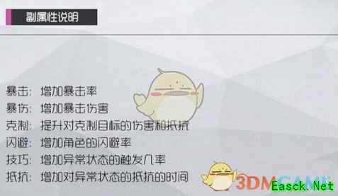 副属性为技巧、暴伤、暴击、抵抗、克制、闪避,副属性可以有三条,在模块到达5级、10级、15级时激活随机一项副属性