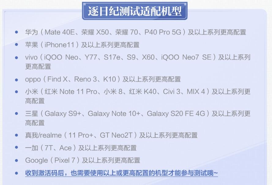 目前游戏已经进行过一次首测,「逐日纪测试」,这次的手机配置需求是: