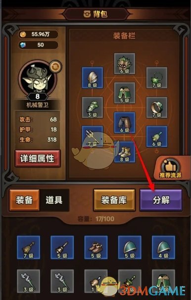 答:前往背包页面找到装备,点击分解,即可获得掉落材料。