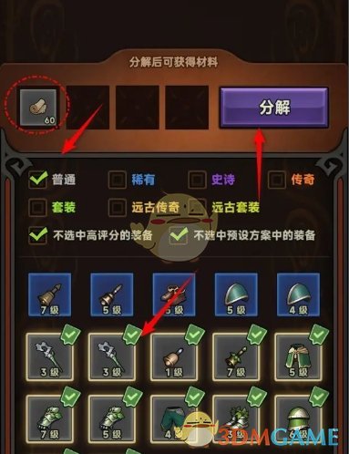 3、最后在分解页面,选择材料,点击右侧的分解即可一键分解装备;