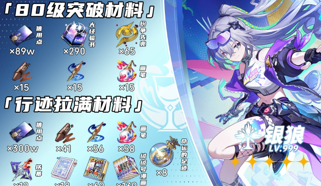崩坏星穹铁道银狼LV999将在4.2周年庆版本中正式实装,作为特殊形态的银狼,其不仅有着极高的人气,其还有着独特的技能机制和实战输出。因此银狼LV999也是版本培养的首选,下面为大家分享银狼LV999的培养材料统计。银狼LV999培养材料一、角色升级+突破(1→80级)信用点:888,000角色经验:漫游指南(紫)289本、冒险记录(金)3本(合计5,810,000经验)专属突破(凝滞虚影-命运重...