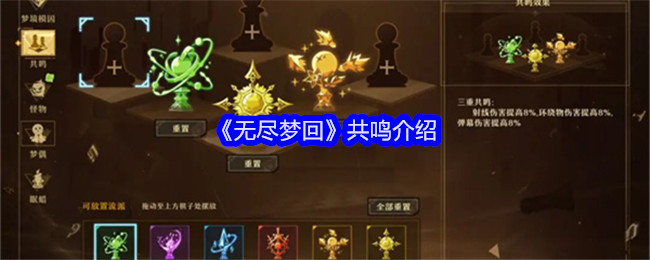 无尽梦回游戏中上阵3个角色,为队伍进入游戏锁定,生效三重共鸣!下面是小编给大家带来的《无尽梦回》共鸣介绍,感兴趣的小伙伴们一起来看看吧。 《无尽梦回》共鸣介绍共鸣浅析如图我们可以上阵3个角色,为队伍进入游戏锁定,生效三重共鸣:分别为三种流派各自的伤害提升 三种不同共鸣三个同种流派,生效也不同 同种流派如下生效作用都不同 同种流派此时我们上两个相同流派和单个流派,单个流派生效为三个同种流派的一半,三...