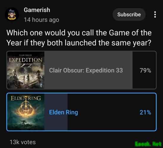 今年的TGA年度游戏由《光与影:33号远征队》获得,而且还拿下了9个奖项,创造拿奖最多的记录!假如本作和往年的年度游戏相比,是否还能胜出呢?有网友发起了一项投票:如果《光与影》与《艾尔登法环》是同年发售,你认为谁能获得年度最佳游戏?1.3万名玩家参与投票,结果显示《光与影》的支持率高达79%,碾压《艾尔登法环》。以下是近六年的TGA年度游戏。游民老哥们,假如它们同台竞技,你会支持谁呢?2025——...