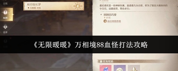 无限暖暖万相境88血怪怎么打?万相境是《无限暖暖》2.2 版本「九色万相生」1 月 30 日上线的永久常驻开放区域,区域含彩蜃城、空鸣峡、九华阙等特色场景,主打东方奇幻市井探索,配套风物任务、探索手记与专属经营玩法。那么新主线应该怎么打怪呢?小编为你准备了一份攻略,一起来看看吧。《无限暖暖》万相境88血怪打法攻略我最开始一直执着于长按蓄力,但是经常被打断而且其实蓄力也没有多少箭后面感觉自己其实手速...
