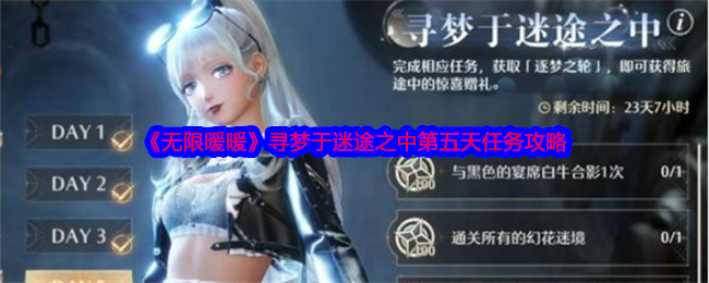 1.3版本传说季 |【寻梦于迷途之中】活动任务分为四个部分,分别在活动的第1天、第2天、第3天和第5天依次解锁。其中第五天任务是通关幻花迷境、升级甜美风格服装100级、收录6张照片、与黑色宴席白牛合影,下面小编给大家带来了《无限暖暖》寻梦于迷途之中第五天任务攻略,助你快速获取100幻彩泡泡·帅气与2w噗灵!>>>>相关攻略:《无限暖暖》寻梦于迷途之中攻略大全 《无限暖暖》寻梦于迷途之中第五天任务...