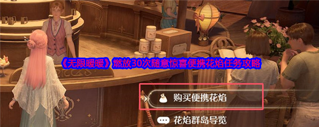 无限暖暖琵琶套第七天任务是,燃放30次随意惊喜便携花焰,很多玩家不知道任务怎么做?下面是小编给大家带来的《无限暖暖》燃放30次随意惊喜便携花焰任务攻略,感兴趣的小伙伴们一起来看看吧。>>>>更多推荐:《无限暖暖》琵琶套弦歌共岁任务攻略大全 《无限暖暖》燃放30次随意惊喜便携花焰任务攻略1、传送到花焰群岛下图所示位置: 2、和阿尔玛对话,选择购买便携花焰 3、随意惊喜便携花焰在最下面,买30个 4...