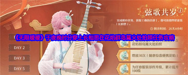 无限暖暖1.2版本活动有一个琵琶套弦歌共岁,弦歌共岁活动期间,每日开放5项目标任务。完成弦歌共岁任务目标,可获得曲韵音律,当曲韵音律达到指定数量时,即可获得【4星琵琶能力套装「长相思1】、【服装设计图:「长相思」】【钻石】等奖励。下面给大家带来了《无限暖暖》琵琶套弦歌共岁任务攻略大全,一起来看看吧! 无限暖暖琵琶套弦歌共岁任务攻略大全:一、DAY 11、制作5次花焰弹 2、乘坐俯瞰日特别版飘然热气...