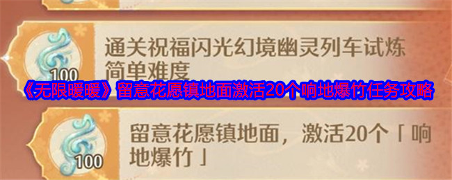 无限暖暖琵琶套第五天有一个任务是,留意花愿镇地面激活20个响地爆竹,很多玩家不知道任务怎么做,下面是小编给大家带来的《无限暖暖》留意花愿镇地面激活20个响地爆竹任务攻略,感兴趣的小伙伴们一起来看看吧。>>>>更多推荐:《无限暖暖》琵琶套弦歌共岁任务攻略大全 《无限暖暖》留意花愿镇地面激活20个响地爆竹任务攻略留意花愿镇地面激活20个响地爆竹1、点击活动-朝岁节-朝岁游艺,可以看到有响地爆竹 2、...