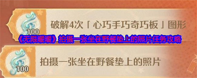 无限暖暖琵琶套第五天有一个任务是,拍摄一张坐在野餐垫上的照片,很多玩家不知道任务怎么做,下面是小编给大家带来的《无限暖暖》拍摄一张坐在野餐垫上的照片任务攻略,感兴趣的小伙伴们一起来看看吧。>>>>更多推荐:《无限暖暖》琵琶套弦歌共岁任务攻略大全 《无限暖暖》拍摄一张坐在野餐垫上的照片任务攻略1、先传送走到下图所示位置: 2、野餐垫在湖边,走过去就可以看到 3、走近一点,点击左下,然后拍照,完成任...