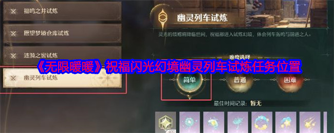 无限暖暖祝福闪光幻境幽灵列车试炼在哪做?无限暖暖琵琶套有一个任务是,通关祝福闪光幻境幽灵列车试炼简单难度,下面是小编给大家带来的《无限暖暖》祝福闪光幻境幽灵列车试炼任务位置,感兴趣的小伙伴们一起来看看吧。>>>>更多推荐:《无限暖暖》琵琶套弦歌共岁任务攻略大全 《无限暖暖》祝福闪光幻境幽灵列车试炼任务位置1、到任意传送点,点击幻境挑战 2、选择祝福闪光幻境 3、选择幽灵列车-简单-挑战即可,这里...