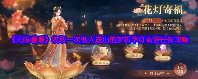 无限暖暖梦祈华灯怎么获得?无限暖暖琵琶套第三天有一个任务是,收取一次他人送出的梦祈华灯寄语,梦祈华灯是氪金道具,大家在哪里可以收取梦祈华灯寄语呢?下面是小编给大家带来的《无限暖暖》收取一次他人送出的梦祈华灯寄语任务攻略,感兴趣的小伙伴们一起来看看吧。 《无限暖暖》收取一次他人送出的梦祈华灯寄语任务攻略1、这个任务感觉有点看脸,不一定就能找到梦祈华灯吧?万一买的人少呢?2、这是一个氪金道具,可以在...