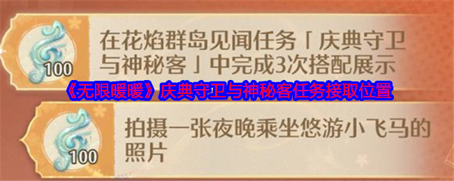 无限暖暖琵琶套有一个任务是,庆典守卫与神秘客中完成3次搭配展示,很多玩家不知道任务在哪里接,下面是小编给大家带来的《无限暖暖》庆典守卫与神秘客任务接取位置,感兴趣的小伙伴们一起来看看吧。>>>>更多推荐:《无限暖暖》琵琶套弦歌共岁任务攻略大全 《无限暖暖》庆典守卫与神秘客任务接取位置1、传送到花焰群岛,这个任务地图中直接会显示蓝色感叹号,位置如下图所示 2、和焦亚对话开始搭配,完成3次就可以了...