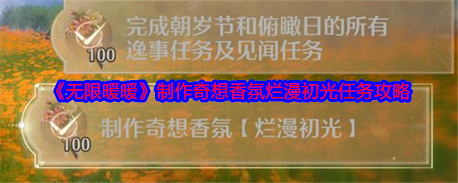 无限暖暖俯瞰日有一个任务是,制作奇想香氛烂漫初光,很多玩家不知道任务怎么做,下面是小编给大家带来的《无限暖暖》制作奇想香氛烂漫初光任务攻略,感兴趣的小伙伴们一起来看看吧。>>>更多推荐:《无限暖暖》晴日时光任务攻略大全 《无限暖暖》制作奇想香氛烂漫初光任务攻略 1、进入花焰群岛,开启任务后,我们打开好友2、点击下面这个人,他会给我们任务 3、然后打开任务-见闻,就可以看到两个香氛任务 4、把两个...