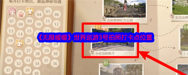 无限暖暖世界巡游3号怎么拍照?世界巡游一共有40个地点需要拍照打卡,3号打卡点在小径边的秋千,下面是小编给大家带来的《无限暖暖》世界巡游3号拍照打卡点位置,感兴趣的小伙伴们一起来看看吧。 >>>《无限暖暖》世界巡游25号拍照打卡点位置 >>>《无限暖暖》世界巡游33号拍照打卡点位置 >>>《无限暖暖》世界巡游34号拍照打卡点位置 >>>《无限暖暖》世界巡游35号拍照打卡点位置 >>>《无限暖暖》世...
