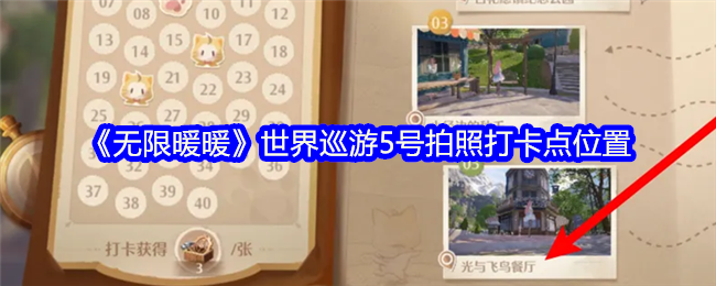 无限暖暖世界巡游5号拍照打卡点在哪?世界巡游一共有40个地点需要拍照打卡,其中第五个打卡点在光与飞鸟餐厅门口,下面给大家带来了《无限暖暖》世界巡游5号拍照打卡点位置分享,一起来看看吧! 《无限暖暖》世界巡游5号拍照打卡点位置1、打开无限暖暖游戏,点击前往箭头位置。 2、然后在光与飞鸟餐厅门口点击拍照。 3、拍照光与飞鸟餐厅,即可完成世界巡游5号拍照打卡。 以上就是小编整理带来的《无限暖暖》世界巡游...