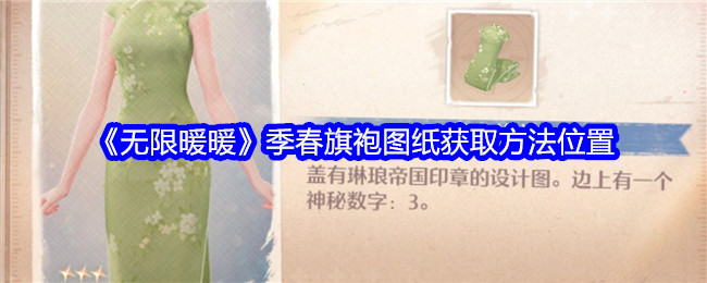 无限暖暖季春旗袍图纸在哪获得?这是一件非常有气质的绿色旗袍,上面盖有琳琅帝国印章的设计图并且在边上还有一个神秘数字3,可通过开启宝箱的方式解锁,下面给大家带来了具体的季春旗袍图纸获取方法位置,不清楚的一起看看吧!《无限暖暖》季春旗袍图纸获取方法位置季春旗袍图纸获取:打开地图选择传送前往古花愿镇的传送点。传送到这(搭配师协会),宝箱在这个房顶绕到房子后面,上去方法如图,需要借助伞,...