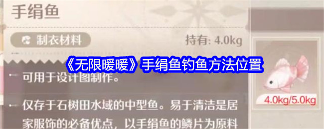 无限暖暖手绢鱼是制作梦寻星愿、角逐、纯白旋风、故乡的风、星愿璨梦、珍珠标点、心愿金蔷薇、素色天然、酸甜缀梦的制作材料,很多小伙伴想知道手绢鱼在哪钓,下面是小编给大家带来的《无限暖暖》手绢鱼钓鱼方法位置,感兴趣的小伙伴们一起来看看吧。 《无限暖暖》手绢鱼钓鱼方法位置 1、手绢鱼分布在石树田村2、传送到下图所示位置: 3、注意钓鱼需要水中有波纹,没有的话就是你钓过了,需要等第二天刷新4、已经解锁图鉴后...