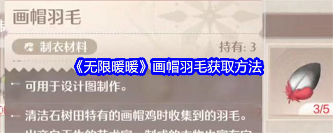 无限暖暖画帽羽毛可用于设计图制作。清洁石树田特有的画帽鸡时收集到的羽毛。出产自天生的艺术家,制成的衣物也富有它们特立独行的艺术气息。画帽羽毛需要给画帽鸡清洁后获得。无限暖暖画帽羽毛怎样获得:画帽羽毛需要给画帽鸡清洁后获得.1、画帽鸡分布在石树田村2、到下图所示位置,长按清洁按钮,出现图标后松开,可以不惊吓动物3、解锁图鉴后,点击地图左下角可以直接追踪以上就是小编整理带来的《无限暖暖》画帽羽毛获取方...