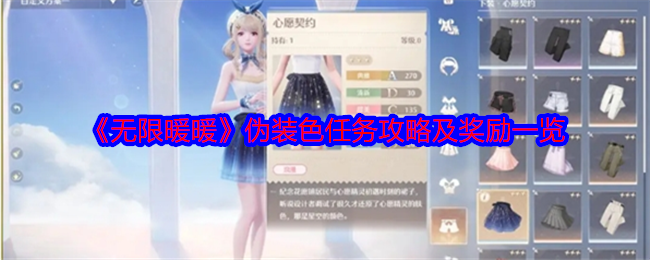 无限暖暖伪装色任务如何完成?游戏中点亮灵感·伪装色是一个见闻任务,任务服装在花愿镇的马尔克斯服装店,完成任务将获得20钻石, 晴夜飞星*图纸,下面给大家带来了《无限暖暖》伪装色任务攻略及奖励一览! 《无限暖暖》伪装色任务攻略及奖励一览萝西总在晴朗的白天(5点-21点)徘徊于后山通向愿望梦境仓库的小路上,思考如何用合适的装扮混入心愿精灵之间。换一身装扮或许可以给她一些灵感。任务服装:心愿契约(花愿镇...