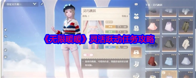 无限暖暖灵活跃动任务怎么做?点亮灵感·灵活跃动是无限暖暖游戏中的见闻任务之一,该任务需要与佩茜对话后按照说法获得时装后完成,下面是小编给大家带来的《无限暖暖》灵活跃动任务攻略,感兴趣的小伙伴们一起来看看吧。 《无限暖暖》灵活跃动任务攻略佩茜总在晴朗的白天(5点-21点)徘徊于绿野活动支援中心的球场她想要参加有趣的运球活动,却没有一件适合跳跃的下装。换一件合适的装扮造访,或许可以给她一些灵感。任务服...