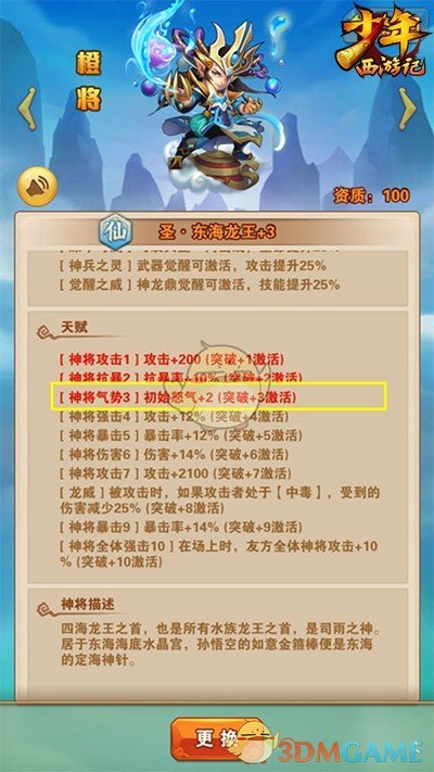 《少年西游记》中东海龙王变成了一个有着尖耳朵,手带爪套的少年,而且看技能似乎变成了毒属性的龙?对于东海龙王技能不了解的小伙伴,下面我们就来介绍一下东海龙王吧。 背景 四海龙王之首,也是所有水族龙王之首,是司雨之神。居于东海海底水晶宫,孙悟空的如意金箍棒便是东海的定海神针。定位 资质:100收集90个碎片可合成。东海龙王定位是仙族竖排输出角色,毒杀全场。技能 普通攻击:【怒涛】对敌方前排造成96%伤...