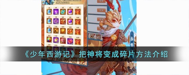 少年西游记游戏里玩家怎么把神将变成碎片呢?相信还有不少游戏玩家不清楚怎么玩,下面小编给大家带来了游戏中把神将变成碎片的方法介绍,有兴趣的小伙伴一起来看看吧,希望能够有所帮助。 少年西游记怎么把神将变成碎片1、神将可以分解为绿色品质及以上的碎片、碎片、将魂、升级经验、银两和丹。2、返还所有升级过程中消耗的经验和银两,以及返还所有突破过程中消耗的突破丹、宝石和银两。3、返还法宝升级中消耗的所有法宝经验...