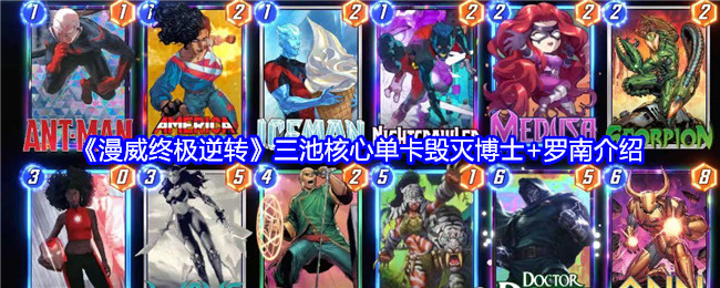 本次给大家带来了《漫威终极逆转》三池核心单卡毁灭博士+罗南介绍!游戏中每人可随机获得一张三池卡,虽然都是三池卡,但卡与卡之间的强度有着巨大的差距,这里给大家介绍两张三池卡,毁灭博士和指控者罗南,如果大家随机到这两张卡,那么恭喜你中奖了,本文将带来这两张卡背后的故事,以及分享围绕这两张单卡组建的构筑和玩法解析,让我们开始吧。《漫威终极逆转》三池核心单卡毁灭博士+罗南介绍毁灭博士背景故事简介:毁灭博士...