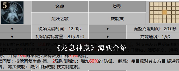 龙息神寂海妖是谁?这个角色因其独特的唱歌魅惑敌人技能以及那宛如美人鱼般的迷人形象,被玩家们亲切地称为海妖,实际上这位角色是一张强度极高的金卡,所以也是很多玩家之前组队当中会考虑到的一个核心角色。《龙息神寂》海妖介绍从定位来看海妖属于辅助角色,她的队长技在所有战斗中都能发挥重要作用,可以提升所有队友30%的生命值,这一技能让队友们在战斗中拥有更厚实的生命储备,增强了整体的生存能力,首先是生命光环技能...