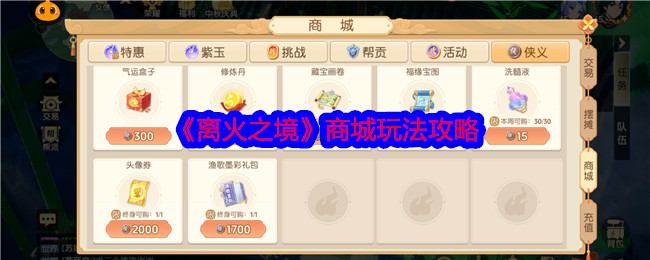 离火之境如何玩转离火商城?商城有很多提升自己的材料, 很多玩家想知道如何最大化呢?下面是小编给大家带来的《离火之境》商城玩法攻略,感兴趣的小伙伴们一起来看看吧。 《离火之境》商城玩法攻略1、绑玉和真玉商城,钱多怎么来怎么来,最好买那些打折商品,小氪玩家建议攒着买神兽内丹或者内丹礼包。2、挑战商城,神兽内丹16000币,需要耐住寂寞才能买到。平民玩家获得内丹的途径之一,其他物品也可以酌情购买。3、帮...