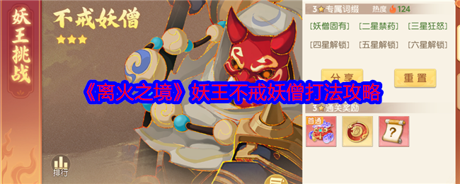本次给大家《离火之境》妖王不戒妖僧打法攻略,先打小怪,再打主怪。低星可以先集火不戒妖僧,高星不戒妖僧血量太多秒不掉,不建议集火。优先集火纵火妖将,控制降龙妖将,后续再集火降龙妖将,这两个怪处理完之后,压力会小很多。 《离火之境》妖王不戒妖僧打法攻略一、不戒妖僧技能介绍奇数回合:不戒妖僧对玩家阵营随机蛊惑2名单位并召唤镜像到妖王阵营,一个是高物防低法防的失心镜像,另一个是高法防低物防的失防镜像,在镜...