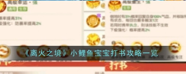 《离火之境》小鲤鱼宝宝是一个免费神兽,拥有较强的战斗能力,玩家可以根据个人需求选择合适的技能书就能提高其整体实力,下面小编为大家整理了详细的小鲤鱼宝宝打书攻略,希望能帮到各位。 离火之境小鲤鱼宝宝怎么打书一、前期1、打书推荐:招暴、波动、溅射、升龙、执念、重生。 2、前期首先需要提高小鲤鱼宝宝的输出和生存能力,玩家可以根据个人的实际情况进行改变。 二、后期1、打书推荐:幸运、防御、强壮、治愈、坚守...