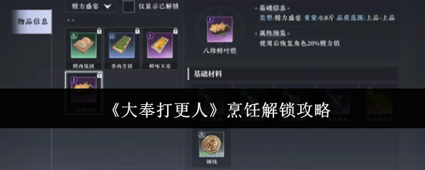 大奉打更人烹饪怎么解锁?这一期要带大家看的是,大奉打更人烹饪怎么解锁,虽然这是一个武侠类型的游戏,但玩家除了带领角色,在江湖中自由的行侠仗义或者探索之外,还可以解锁副职,通过这些副职玩家可以拥有其他额外的能力,烹饪是其中的一种,下面就会把具体的解锁方法以及烹饪能起到的作用全都分享出来,对于其他的副职也会跟大家简单的进行介绍。《大奉打更人》烹饪解锁攻略想要解锁烹饪,玩家首先需要去完成主线任务,在主线...