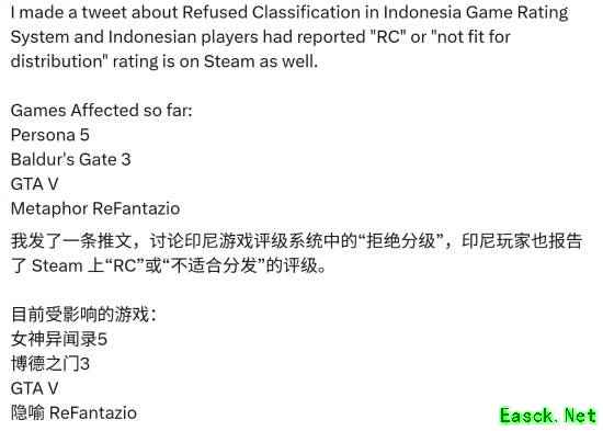 近日,据海外博主@SEAGamethetic爆料,Steam印尼区多款知名大作被标注“拒绝分级(RC)”,引发玩家热议与担忧。目前受影响的游戏包括《女神异闻录 5:皇家版》、《博德之门3》、《暗喻幻想:ReFantazio》等作品。根据印尼游戏分级体系(IGRS),“拒绝分级(RC)”等同于游戏被禁,一旦标注将面临强制下架风险。博主此前已就该分级规则向Steam官方咨询,Steam回应称印尼分级将...