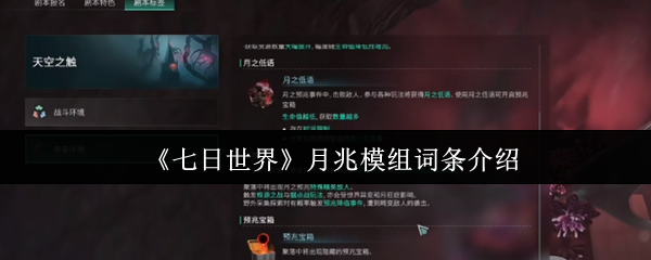 七日世界月兆模组词条怎么样?具体的属性到底是什么?一起来看一下七日世界月兆模组词条怎么样。如果大家有兴趣的话,就可以一起来了解一下,下面就为大家来分析一下这方面的内容。《七日世界》月兆模组词条介绍月兆后缀模组在过去的时候会有特定的条件。新手剧本中没有办法获取,玩家要在赛季结束之后,然后去报名一些带有月之预兆标签的剧本。在进入剧本之后就有两种方法获取,一种是开启预兆宝箱,另外一种是击败月之幽影,在成...