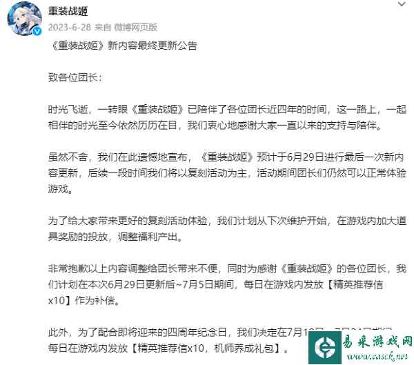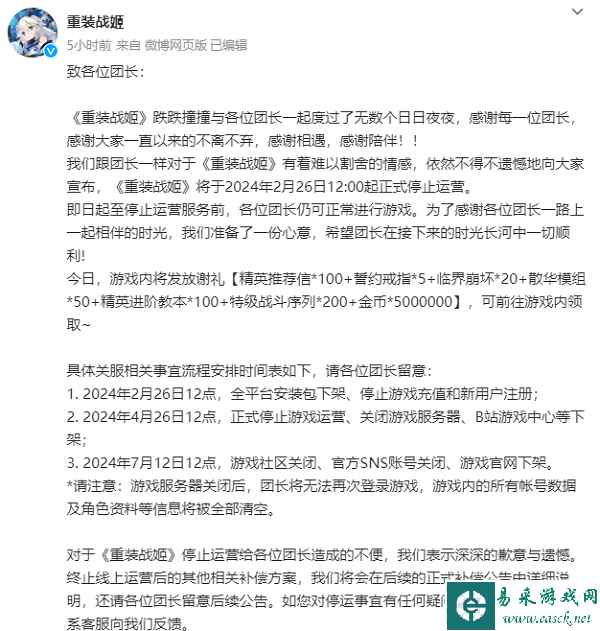 手游《重装战姬》在近期宣布了有关于停服的消息。官方表示会在近期将游戏的下载渠道关闭,随后关闭服务器。在这最后的时间里,官方发放给了玩家许多可使用资源。
