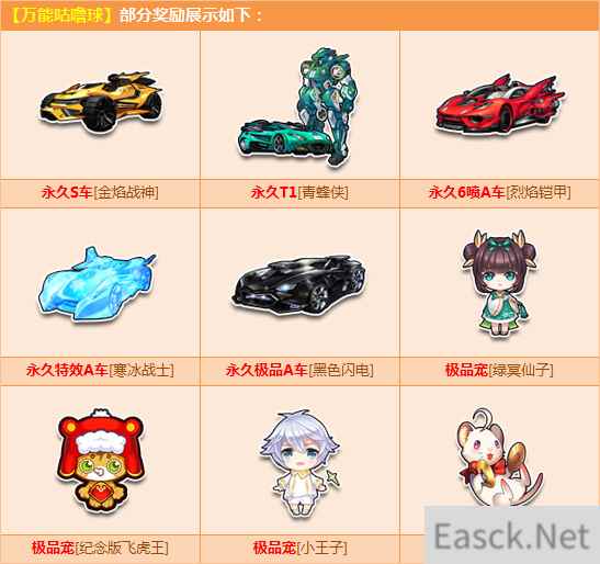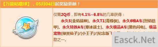 5月4日起,【万能咕噜球】更新,仅需2Q币就有4.1%~6.8%的几率获得永久S【金焰战神】、永久T1【青蜂侠】、永久A车【烈焰铠甲】/【寒冰战士】/【黑色闪电】、极品宠物【绿冥仙子】/【小王子】/【纪念版飞虎王】/【乐师希瑞】或其他奖励之一!