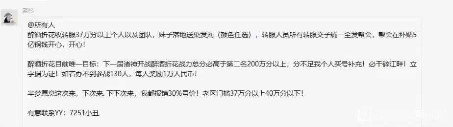 根据当时招兵令显示,蓝区长对外招收战力37万以上的顶级高战玩家加入团队,凡是愿意前去投奔的,蓝区长都会报销全额的转服费用,女玩家的话,还会额外赠送价值数千元人民币的高级染发剂。