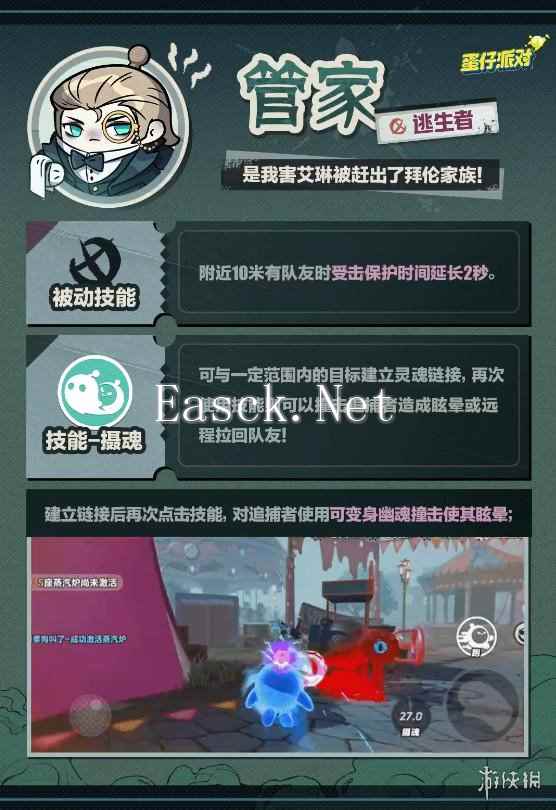 当逃生者“管家”上场时,将触发其被动技能:管家附近10米有队友时,受击保护时间延长2秒。“管家”拥有技能“摄魂”,发动时技能时,可与一定范围内的目标建立灵魂链接,再次使用技能则可以撞击追捕者造成眩晕或远程拉回队友。