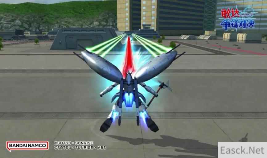 切换为MS形态的同时,向后上方翻滚的同时发射大量鱼雷攻击目标,再使用胸部复相光束炮和两个盾牌的三联装光束炮进行长照射攻击,造成击飞效果。