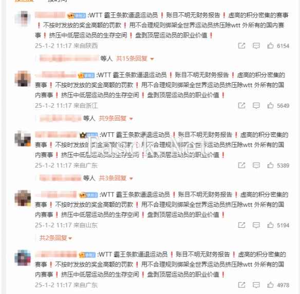 不过,球迷和粉丝依然对WTT非常不满,尤其是其近期因规则调整导致樊振东和陈梦退出世界排名一事更是耿耿于怀。不少球迷和粉丝在评论区疯狂刷屏,要求WTT取消霸王、绑架条款。