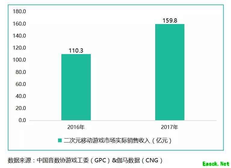 二次元产业横跨动画、漫画、小说、游戏等多个领域,在2014年二次元游戏的产业规模就超越了其它领域,并引领二次元市场的发展。《2017年中国游戏产业报告》发布的数据显示,2017年中国二次元游戏市场实际销售收入达159.8亿元人民币,同比增长45%。多款二次元游戏产品在市场中持续稳定表现,以及一些新产品的营收快速增长,各大游戏厂商也从前几年快餐式的批量投放产品、撒网式的买量策略,转为精品游戏内容的精细化运营路线,二次元游戏逐渐受到了各大游戏厂商的重视,成为了中国游戏市场的重要细分领域。