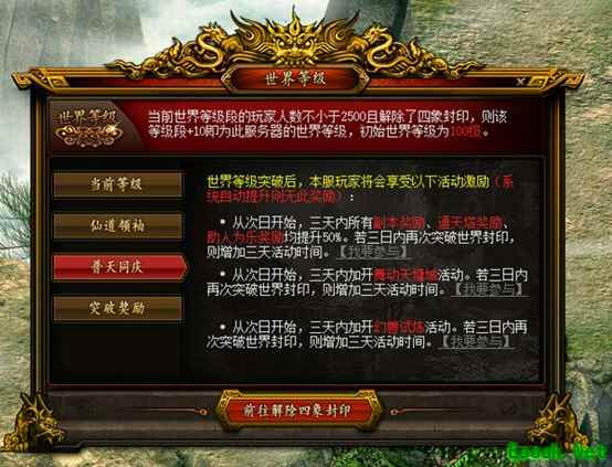 当世界等级通过挑战四象封印和冲级人数达标的方式提升时,还将自动开启普天同庆奖励:世界等级提升后,从次日开始,三天内,所有副本奖励、通天塔奖励、助人为乐奖励均提升100%;突破等级锁之后,从次日开始,三天内,加开舞动天墉城和幻兽试炼活动;若本周两次突破,则第二次加开顺延。
