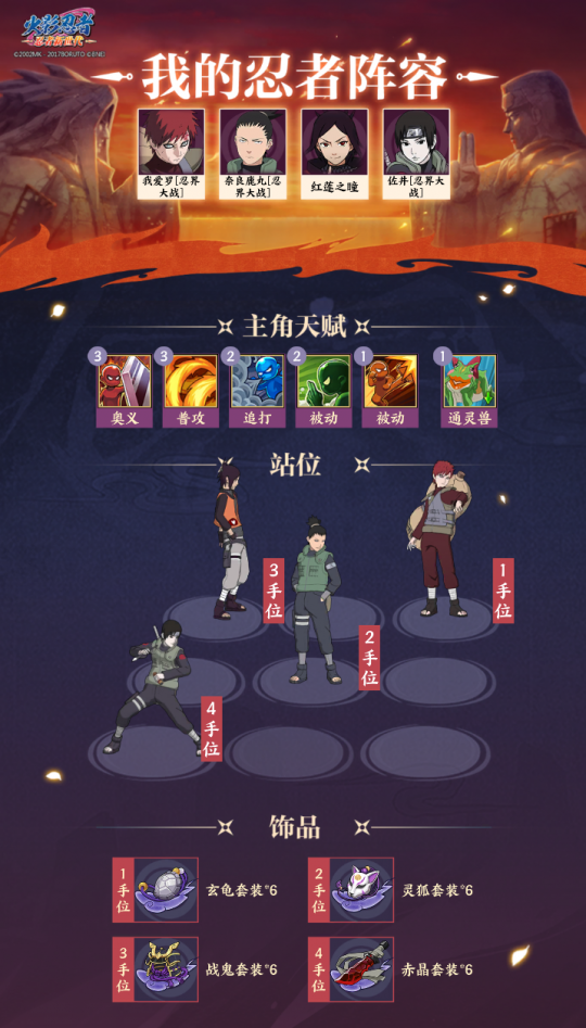 2、阵容二:我爱罗[忍界大战]+奈良鹿丸[忍界大战]+佐井[忍界大战]+红莲之瞳;