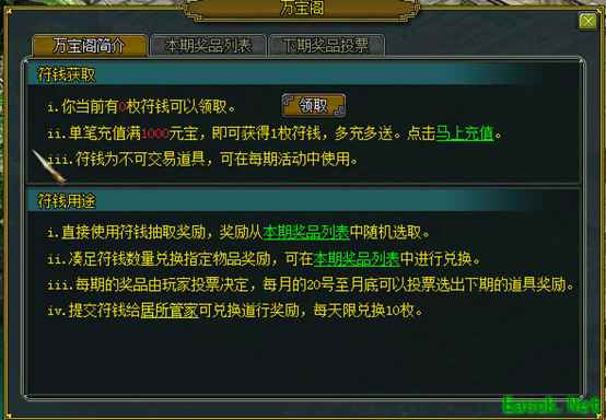 每个月20号至月末,在当月充值超过1000元宝的玩家可以对下一期的可兑换奖励进行投票,决定下一期万宝阁中的道具类型。