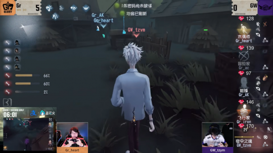第二天,GW vs Gr第一局下半场,GW_tzym无张狂宿伞之魂开局诸行无常至冒险家所在区域,Gr_ac冒险家未提前藏匿踪迹而露出脚印,只得下板利用膝跳弹射拉开距离转点至双十一板区,宿伞之魂蓄力刀配合冲动效果,Gr_ac盖板的同时极限抽中第一刀,而后诸行无常拉近身位,蓄力刀快速击倒冒险家,此时场上密码机远远不够。Gr_AK前锋拉球干扰,GW_tzym早有防备,视角锁定前锋赶来的方向,快速将人放下,故未被影响上挂节奏。Gr_iron飞行家一救,GW_tzym追击冒险家的时候,前锋想赶来干扰但因判断失误并未对监管者造成眩晕,反而自己状态受损,紧接着GW_tzym为抢节奏,且前锋也去补状态,监管者选择直接闪现将冒险家击倒。挂上冒险家的一瞬间,发现前锋状态已经被补好,分析出前来救援的一定是木偶师,只有飞行家会破译密码机,而且冒险家下椅子无道具面对二阶宿伞之魂后也没有更多的牵制能力,为了后续控场,监管者放弃守椅出去干扰密码机进度。待木偶师将人救下后,宿伞之魂再次诸行无常利用荡魄击倒冒险家。前锋拉球将冒险家救下,但因为被撞的时候冒险家已经处于被牵起的状态,被撞救下后有挣脱后摇,不能及时拉开距离而被再次击倒。淘汰冒险家后,GW_tzym选择追击木偶师,骗出一次“路易”后,发现不能快速处理掉木偶师,则吸魂赶路去干扰正在修机的飞行家,再杀一个回马枪去追击木偶师,不断消耗两边的状态并拖慢密码机进度,进入控场模式。虽然木偶师下板抵消了荡魄的僵直,但是处于判定校准期间不能及时成为“路易“,还是被快速击倒并上挂。GW_tzym乘胜追击,直接传至飞行家身边,隐藏红光蓄力刀将其击倒。直接追击飞行家这一决策不仅消耗了飞行家的道具,同时让前锋疲于奔命,使其化险为夷无用武之地,并且压制住一边的门,为开门战做铺垫。宿伞之魂利用垂径定理精准排到木偶师的位置,木偶师成为“路易”准备强行救人,GW_tzym细节利用无住涅槃封住小木屋窗户点位对其进行交互减速,成功在密码机压好前将其击倒,紧接闪现快速将人牵起并挂上。在博弈地窖逃生的过程中,Gr_AK决策失误,拉球僵直使宿伞之魂成功吸魂不能跳地窖逃生,两人只能隔板相望,最后还是闪现cd先冷却结束,结束了这场拉锯战,GW_tzym收割四抓,为本赛季的第一场胜利吹响进击的号角。