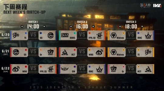 在下周的比赛中,表现稳步上升的TE溯战队对战发挥一直较为稳定的成都GG战队,两支队伍间能擦出怎样的火花?找回状态的成都Wolves对阵连续两周稳居榜一的MRC战队,狭路相逢究竟谁能更胜一筹?北京WBG和排名不相上下的FPX.ZQ战队的对决,又会是怎样的一番风景?敬请期待6月20日14:00第五人格赛事直播间,我们不见不散!