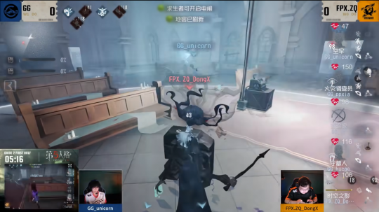 第一天, FPX.ZQ vs 成都GG第二局上半场,FPX.ZQ_DongX时空之影开局追击GG_18的冒险家,卡翻窗释放异族本相将侵蚀度叠加到59%,本体继续追击冒险家,伊斯人调去红毯寄生GG_kucao干扰密码机破译,而后收回伊斯人在空地对冒险家再次叠加异族本相对其进行控制,但因为身距较大,使冒险家还是能拉点进小门一板一窗,并且成功飞轮进板的同时,规避掉了本体的异族本相,此时FPX.ZQ_DongX只能闪现开刀,GG_18转点回大房,在翻大房窗户的同时细节转视角预判伊斯人的异族本相,没有被恐吓僵直而造成不能翻窗,利用翻窗加速拉开距离,继而转至小房进行牵制,没有任何牵制道具的冒险家在GG_18的手里也能一溜将近三台,可以看得出GG_18扎实的牵制功底。GG_unicorn空军就近前来救援,将有化险为夷的守墓人留下为后续更方便救地下室的人埋下伏笔,GG_unicorn巧妙后撤步折掉一刀而后开枪,利用眩晕时间赶到椅子前,虽然时空之影在最后一刻传送至狂欢之椅前的陶片并用异族本相打断救人动作,但可惜FPX.ZQ_DongX没在第一时间出刀,GG_unicorn眼疾手快抓住机会把冒险家救下。FPX.ZQ_DongX二挂冒险家将其挂至地下室,并同时寄生半状态的空军,再次拉回伊斯人守住地下室方便外出干扰空军破译后折返拦截冒险家和守墓人出地下室,空军也早有预料,提前离开侵蚀领域避免被快速击倒在密码机附近,FPX.ZQ_DongX传送空军拿刀无果,及时传送回地下室追击并击倒冒险家将其淘汰。 GG求生者为避免被时空之影控场,火灾调查员提前多修密码机准备进行两台机之间的拉扯。守墓人在进度比较多的密码机给监管者压力,FPX.ZQ_DongX选择从守墓人入手,寄生并侵蚀传送,将其侵蚀度叠加到61%,闪现开刀逼迫守墓人翻板后下铲,紧接着伊斯人释放异族本相叠加侵蚀度至100%,使其出土并击倒,秒杀守墓人整个过程一气呵成。GG求生者战略部署也不遑多让,空军和火灾调查员进行换位救人,GG_ppxia在伊斯人专注寻找空军机会的间隙,趁其不备无伤将守墓人救下,FPX.ZQ_DongX只能寄生空军并立刻进行侵蚀传送,同时释放异族本相,但空军的回光返照加速让GG_unicorn快速逃离侵蚀领域躲过一劫,没被在开门战的一瞬间被快速击倒,使火灾调查员能第一时间破译小门。伊斯人管控小门,本体追击火灾调查员,火灾调查员拉离小门,守墓人则趁机偷点小门,二人在小门与监管者进行拉扯,监管者只能传送至大门换追空军,最后双方战平。在本轮BP中,最好针对求生者的监管者就是时空之影,而无牵制道具的冒险家主动站出来进行牵制,可见GG求生者方对自己的牵制十分自信,真可谓艺高人胆大。